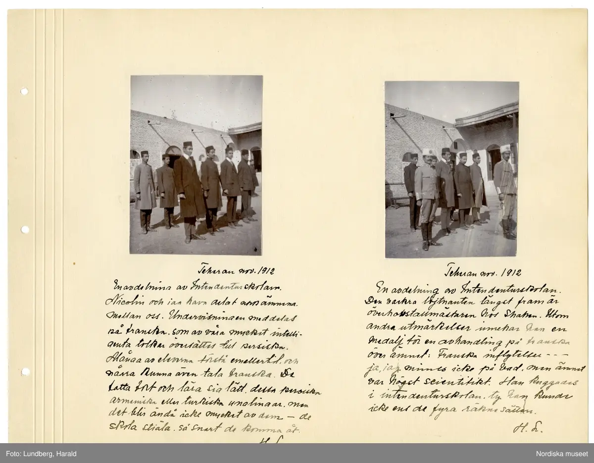 Persien. Vänstra bilden: "Teheran nov. 1912. En avdelning av Intendenturskolan. Nicolin och jag hava delat upp ämnena mellan oss. Undervisningen meddelas på franska, som av våra mycket intelligenta tolkar översätts till persiska. Många av eleverna förstå emellertid, och några kunna även tala franska. De fatta fort och lära sig lätt, dessa persiska, armeniska eller turkiska ynglingar, men det blir ändå icke mycket av dem – de skola stjäla så snart de komma åt." Högra bilden: "Teheran nov. 1912. En avdelning av Intendenturskolan. Den vackra löjtnanten längst fram är överhovstallmästaren hos shahen. Utom andra utmärkelser innehar han en medalj för en avhandling på franska om ämnet 'Franska inflytelser...' ja, jag minnes icke på vad, men ämnet var högst scientifiskt. Han kuggades i intendenturskolan, ty han kunde icke ens de fyra räknesätten." (Anteckningar av Harald Lundberg). Sida ur fotoalbum från Harald Lundbergs vistelse i Persien.