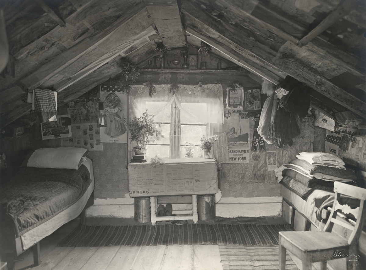 Interiör av backstuga. Småland, Kalmar län, Södra Möre härad. Torsås socken, Linnabacken. Affisch för Skandinaviska Amerikalinjen på väggen.