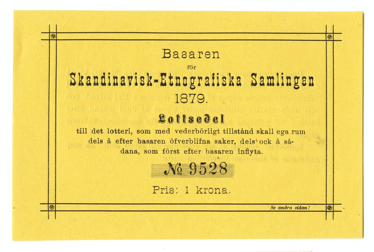 Lottsedel från 1879 års basar för Skandinavisk-Etnografiska Samlingens byggnadsfond