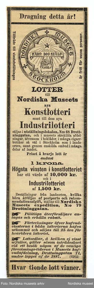 Annons för Nordiska museets konst- och industrilotterier, 1886.