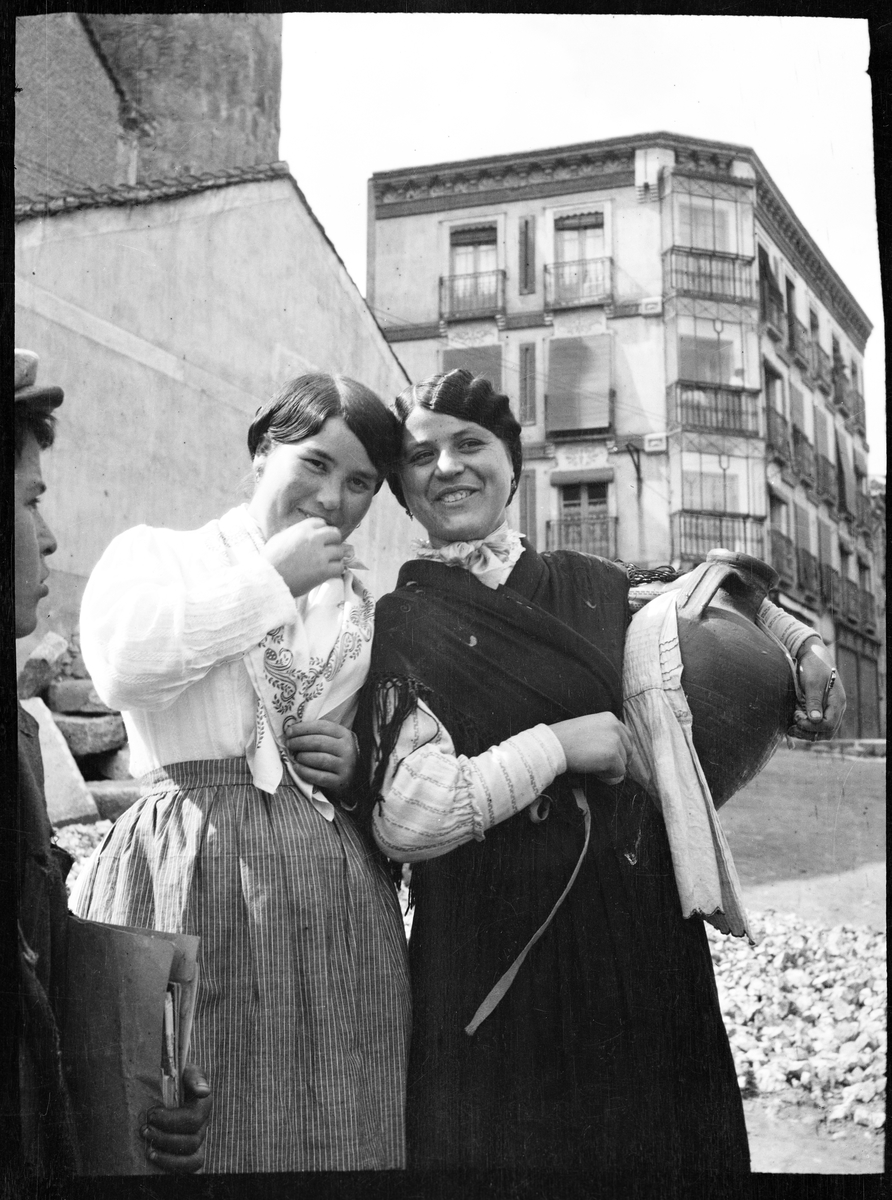 Två leende kvinnor, den ena hållande en kruka. Till vänster skymtar en pojke. Hus i bakgrunden. Troligen Ronda, Spanien.