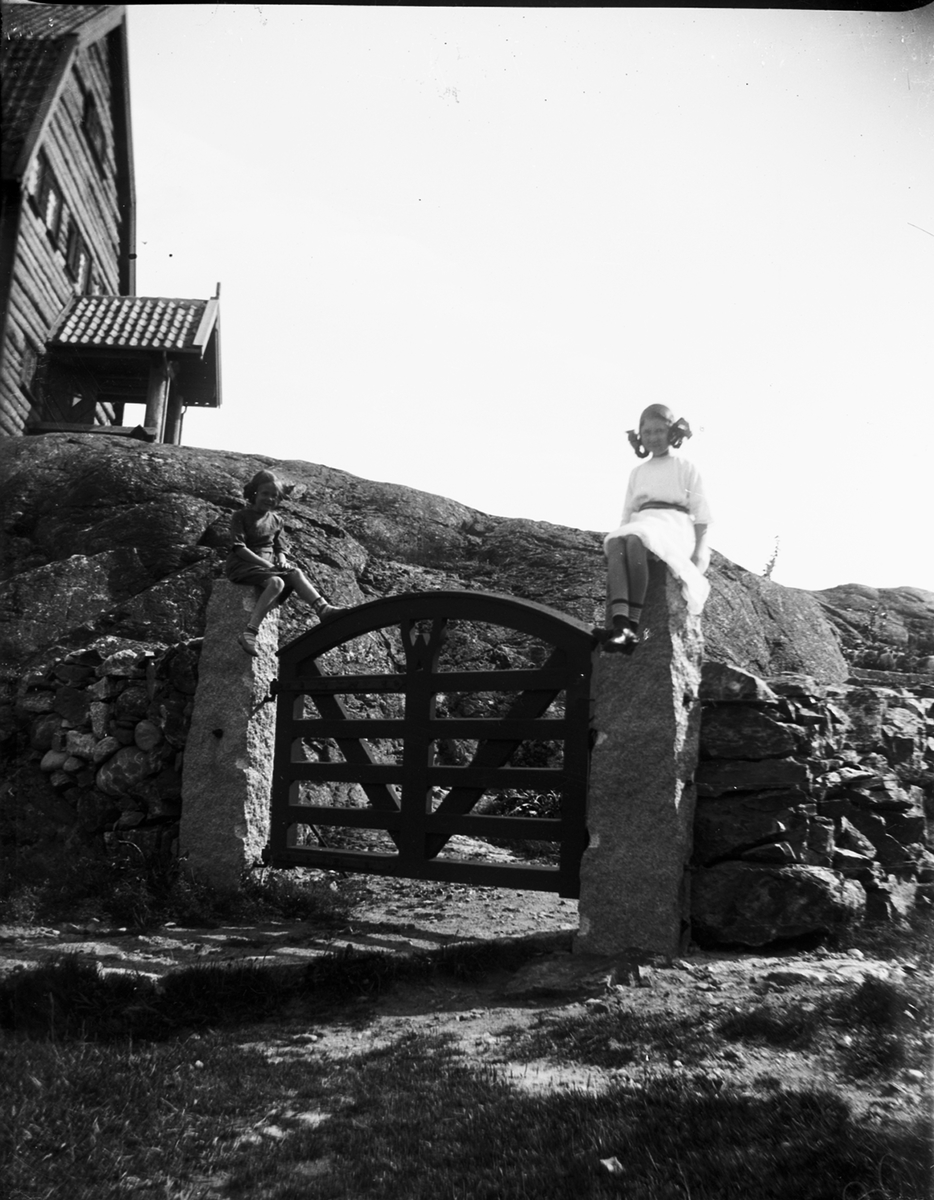 Två flickor sitter på varsin grindstolpe av sten. Fiskebäckskil, Bohuslän.