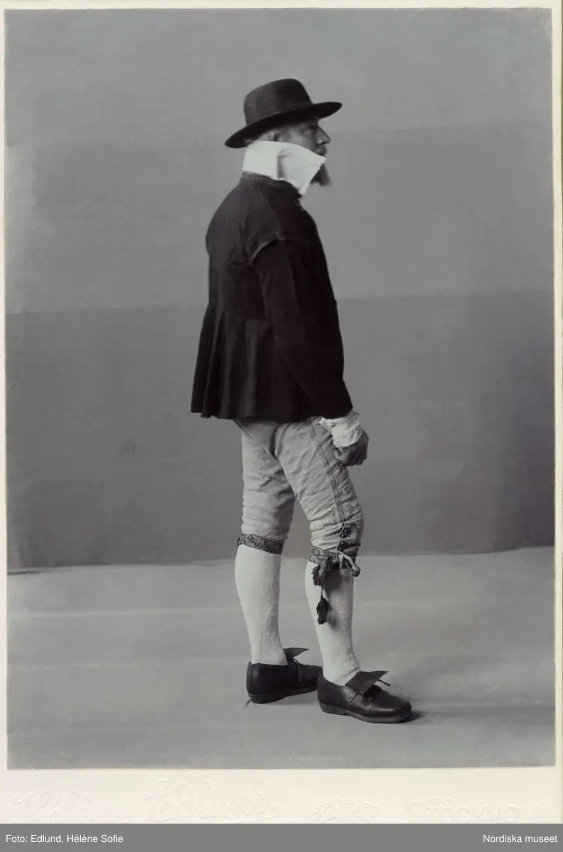 Skäggig man iklädd folkdräkt med knäbyxor, jacka och hatt. Folkdräkt från Herrestads härad i Skåne 1820 - talet.