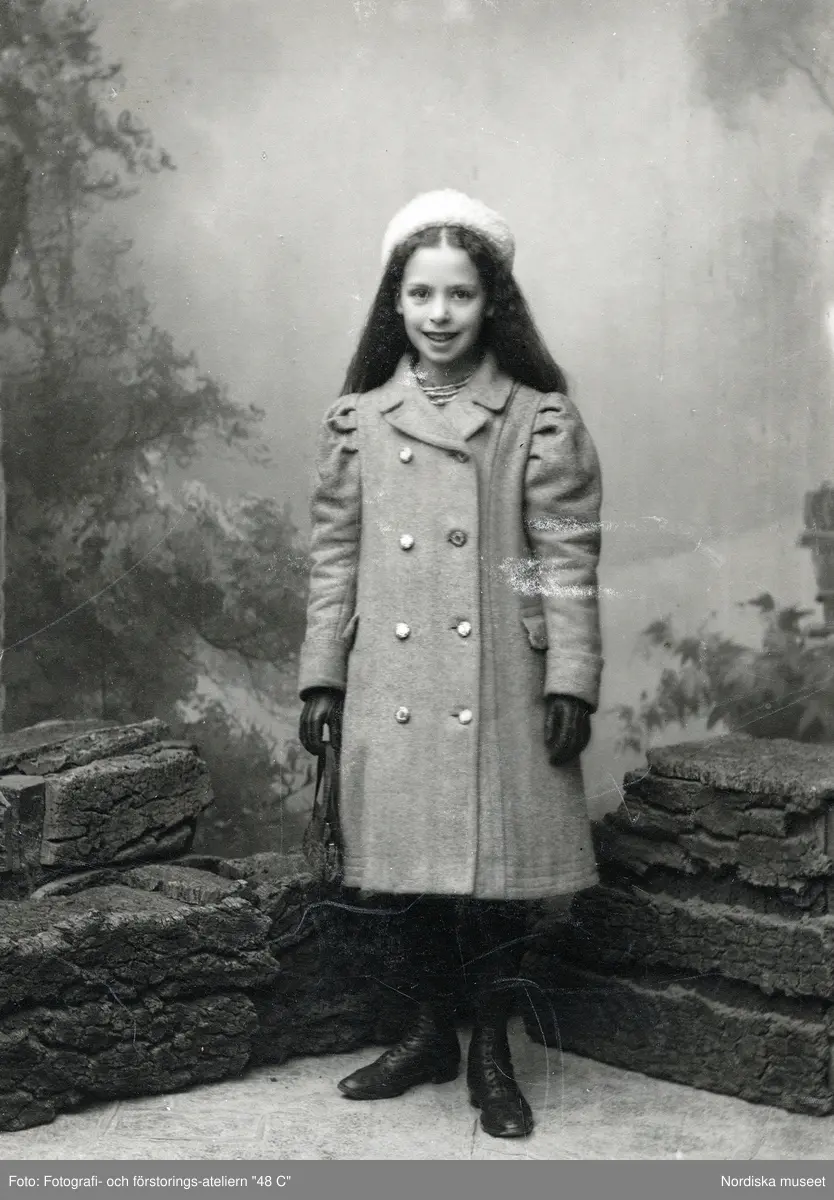 Ateljéporträtt av flicka i vinterkläder; rock, mössa handskar och snörkängor. Kabinettkort