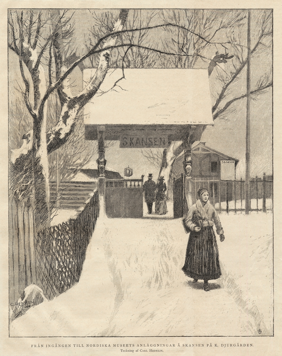 Teckning av Carl Hedelin i Ny illustrerad tidning nr 3 1892 23/1. ”Från ingången till Nordiska museets anläggningar å Skansen på K. Djurgården”.