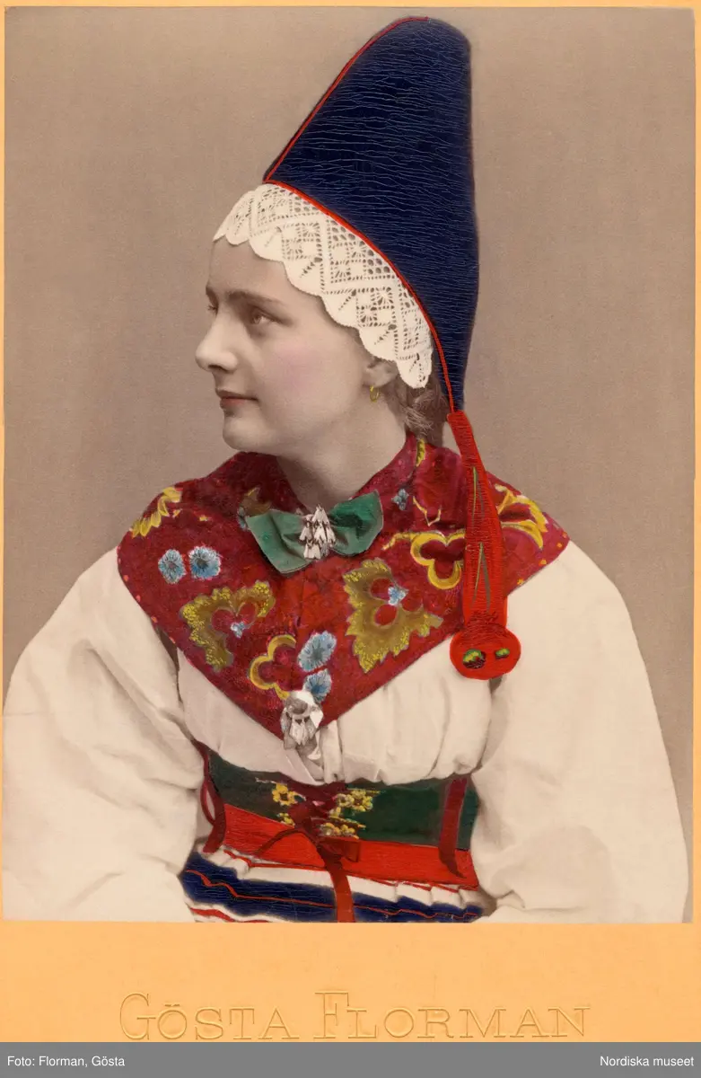 Bröstbild av en ung kvinna i folkdräkt, från Rättvik i Dalarna, med en hätta som har vit spets i framkanten. Kolorerat foto.