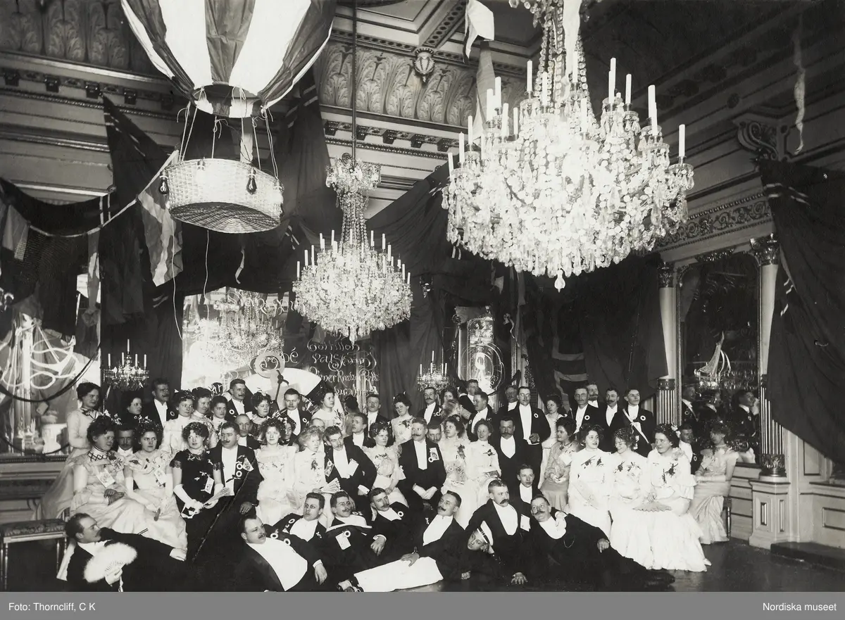 Gruppbild. Troligen föreningsfest hållen 1897 i samband med Andrées ballongfärd till Nordpolen. I bakgrunden anas ett plakat med balens dansordning. I taket hänger en modell av en luftballong.