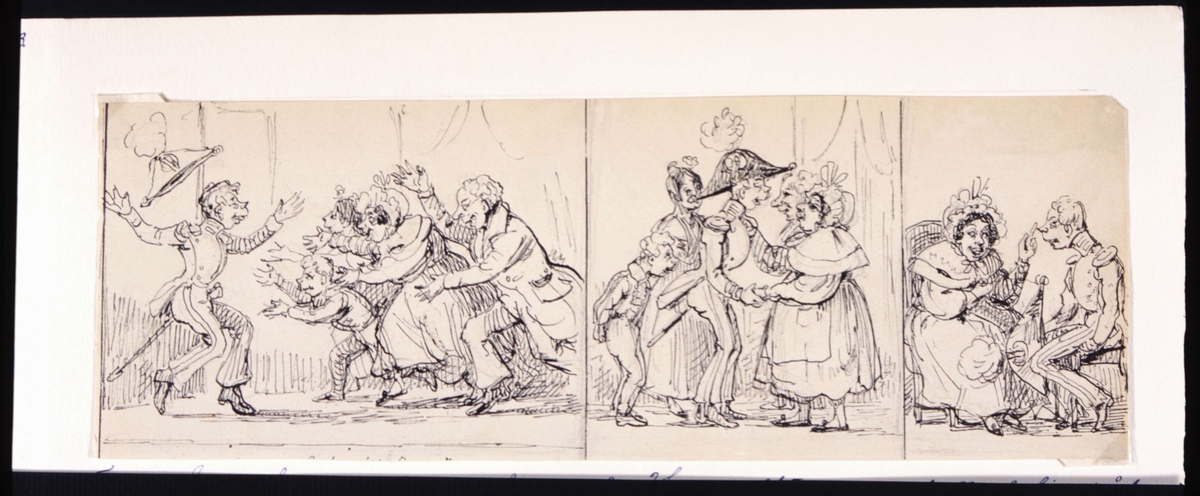 Sparfs äventyr". Unge Sparf kommer hem till familjen, som färdig officer. Tusch av Fritz von Dardel, 1840