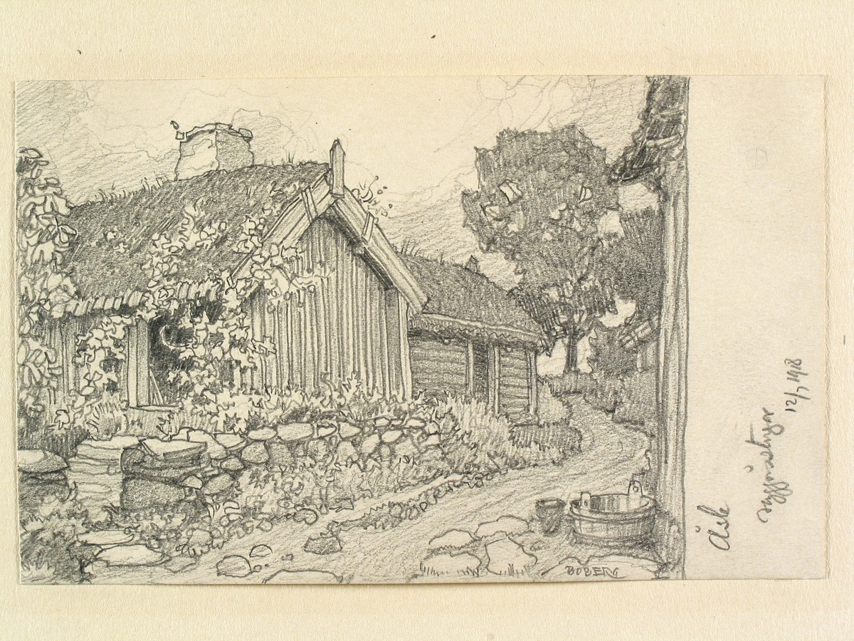 Västergötland, Vartofta, Åsle. Ryggåsstugor. Teckning av Ferdinand Boberg.