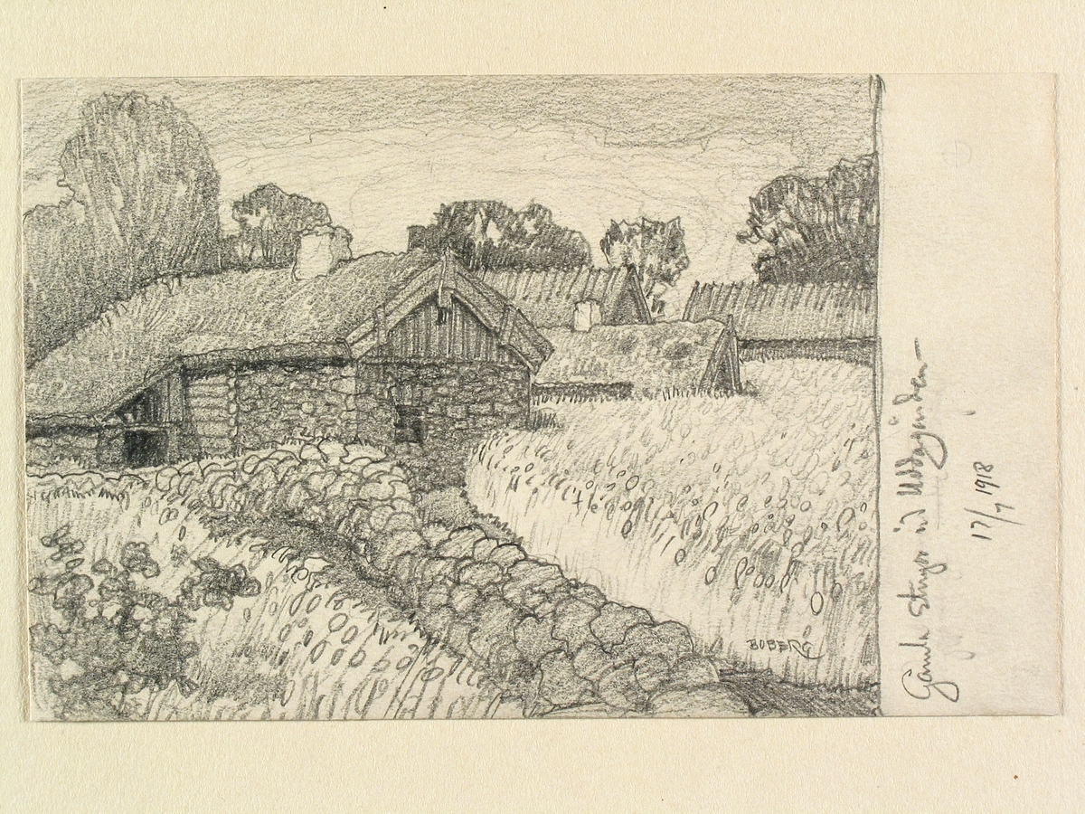Västergötland, Vartofta hd., Åsle sn. "Gamla stugor vid Uddagården". Teckning av Ferdinand Boberg.