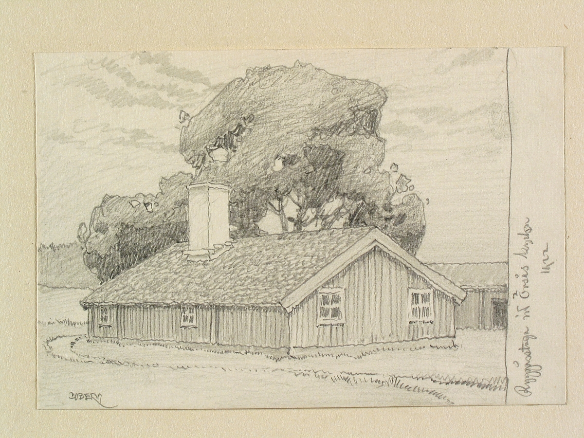 Västergötland, Kinds hd. Ryggåsstuga vid Örsås kyrka. Teckning av Ferdinand Boberg.