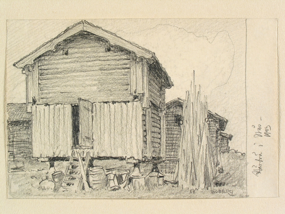 Titel: Dalarna, Nås sn. Härbre i Nås. Teckning av Ferdinand Boberg
