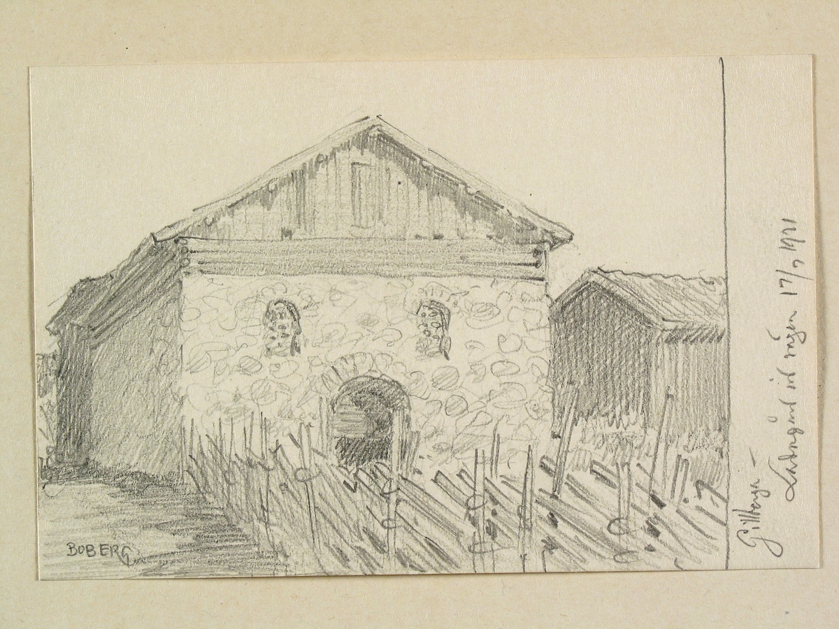 Värmland, Gillbergs hd., Gillberga sn. "Ladugård vid vägen". Teckning av Ferdinand Boberg