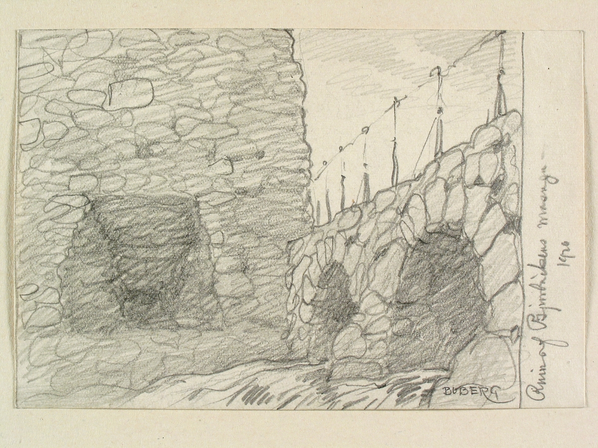 Värmland, Färnebo hd., Lungsunds sn., Bjurbäck. "Ruin af Bjurbäckens masugn". Teckning av Ferdinand Boberg