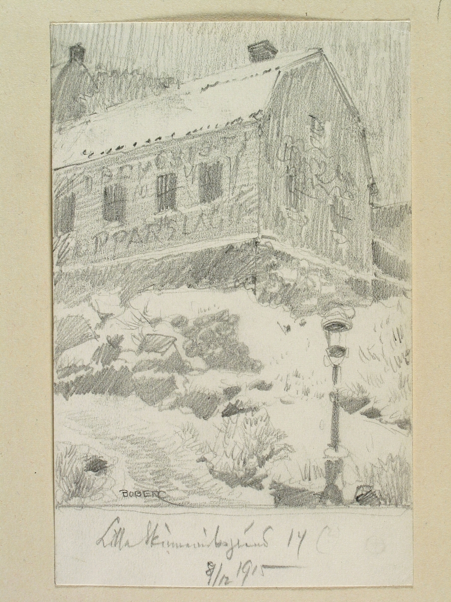 "Stockholm, Södermalm, Lilla Skinnarviksgränd 14", Teckning av Ferdinand Boberg.