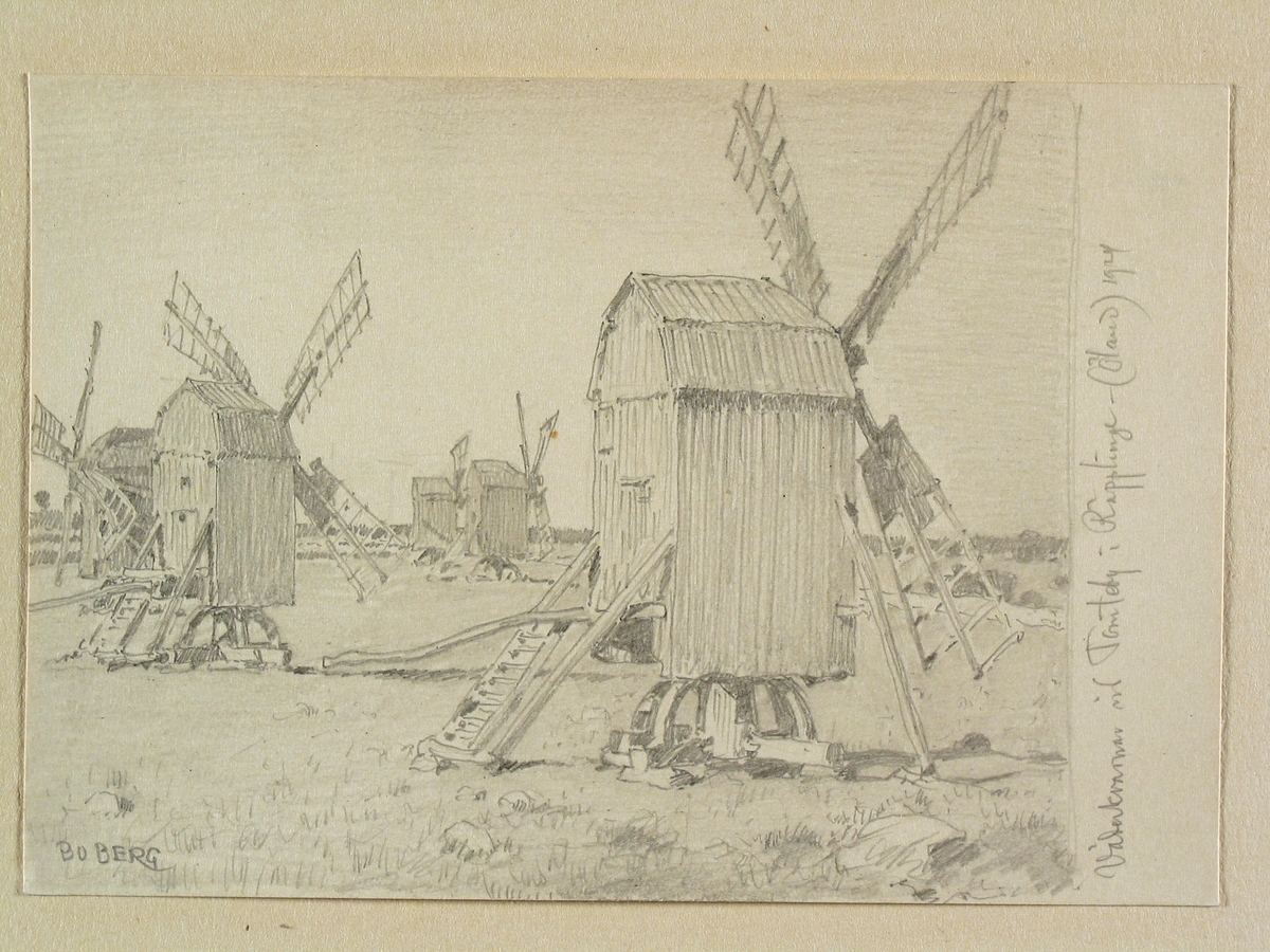Öland, Slättbo hd., Räpplinge sn., Tomteby. Väderkvarnar. Teckning av Ferdinand Boberg.