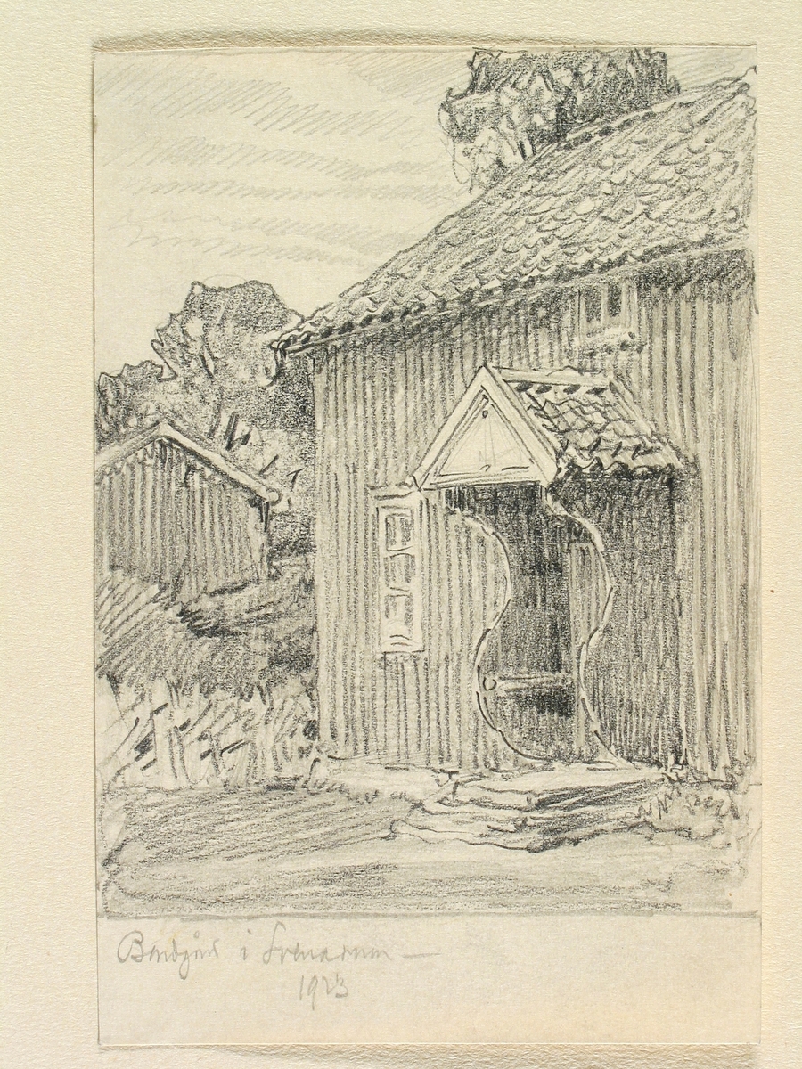 Småland, Västra hd. "Bondgård i Svenarum". Teckning av Ferdinand Boberg