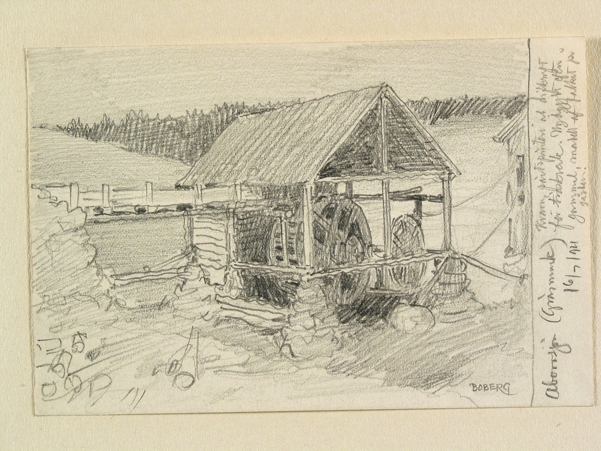 Värmland, Fryksdals hd., Gräsmarks sn., Abborrsjön. Kvarn. Teckning av Ferdinand Boberg
