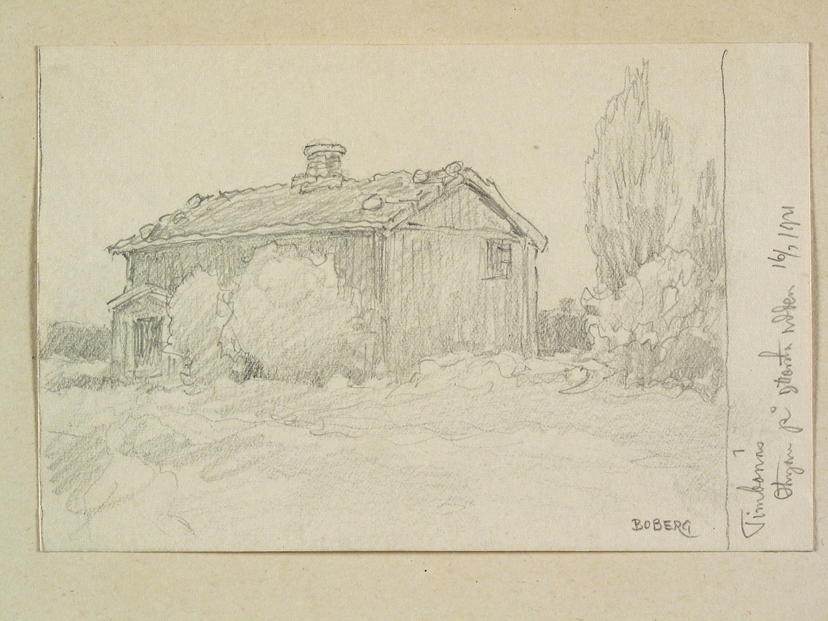 Värmland, Fryksdals hd., Gräsmarks sn., Timbonäs. "Stugan på yttersta udden". Teckning av Ferdinand Boberg