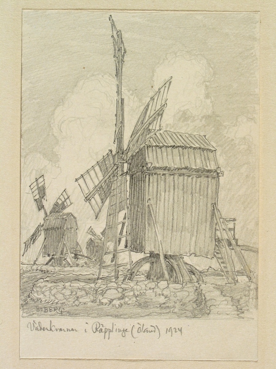 Öland, Slättbo hd., Räpplinge. Väderkvarnar. Teckning av Ferdinand Boberg.