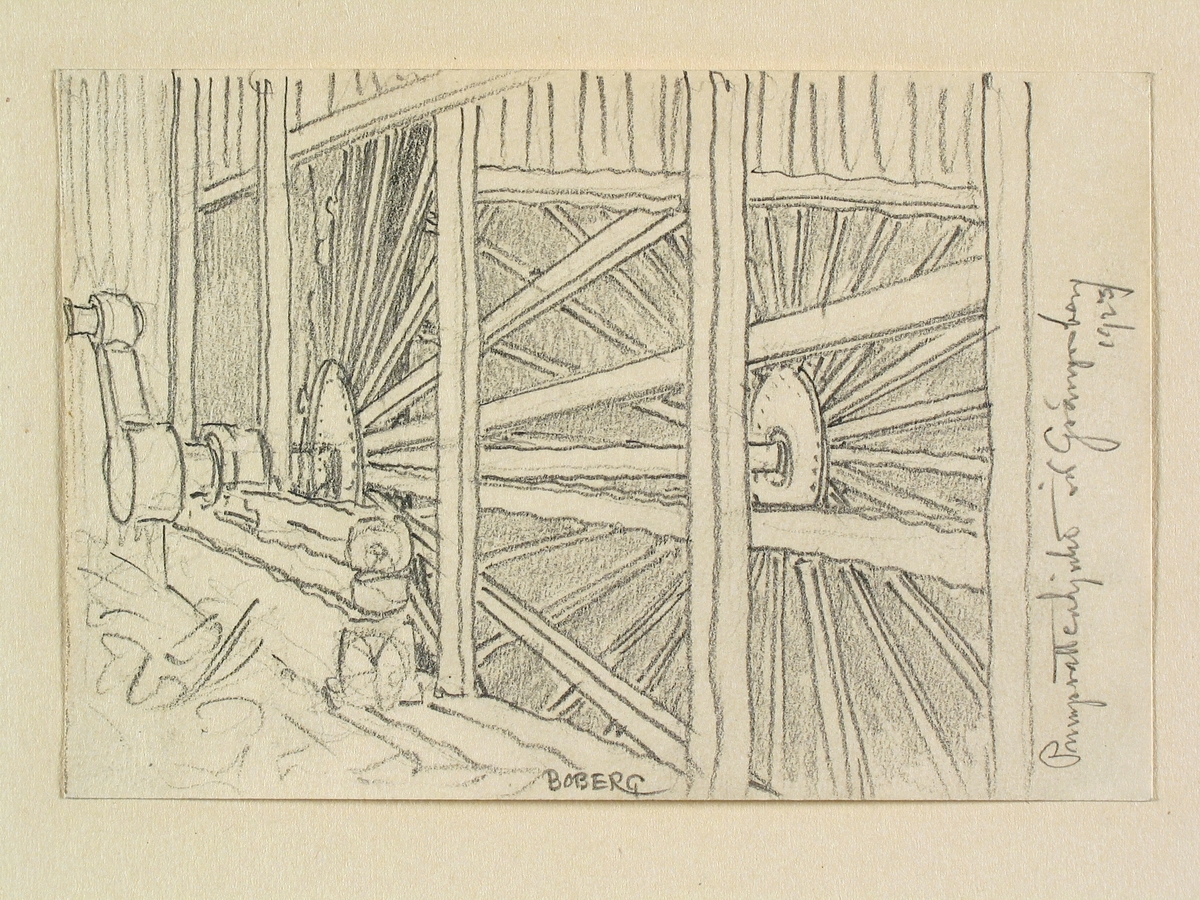 Dalarna, Grangärde sn. "Pumpvattenhjulet vid Grängesberg". Teckning av Ferdinand Boberg