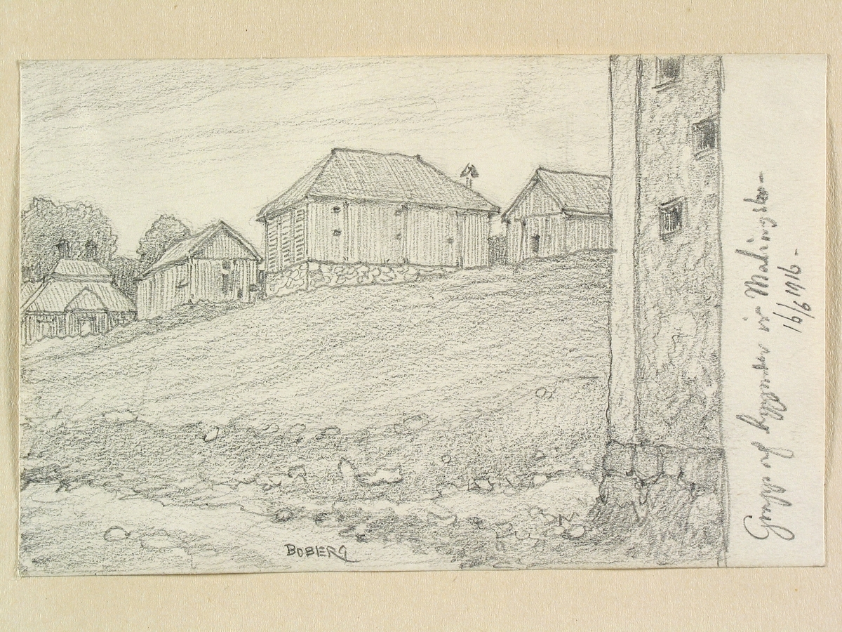 Dalarna, Malingsbo sn. "Grupp af byggnader vid Malingsbo". Teckning av Ferdinand Boberg