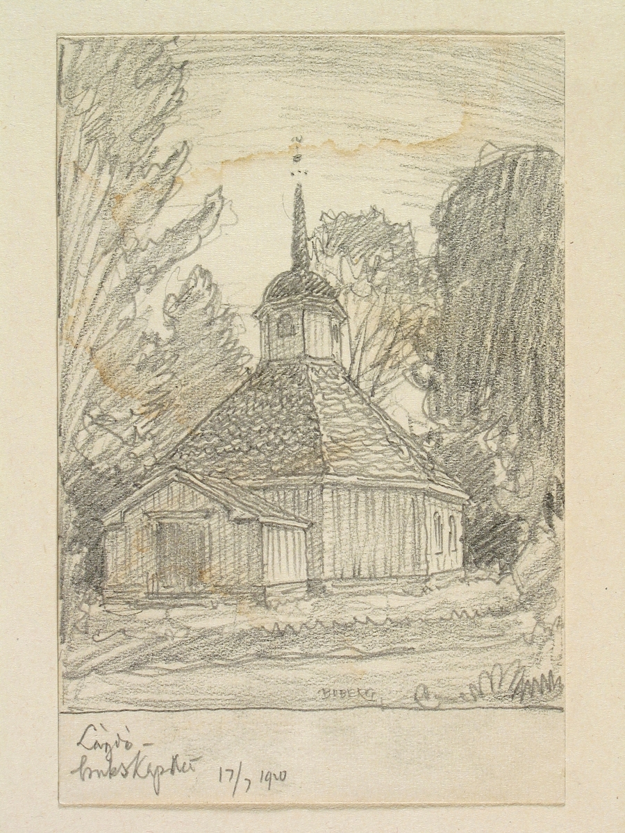 Teckning av Ferdinand Boberg. Medelpad, Hässjö sn., Lögdö bruksförslg., Lögdö kapell,