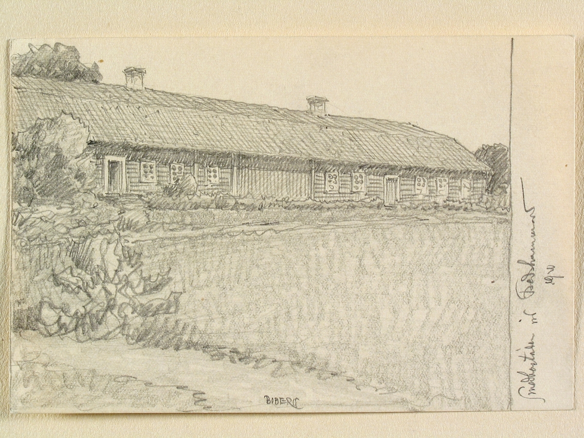 Dalarna, Orsa sn., Fredshammar. Smedbostäder. Teckning av Ferdinand Boberg