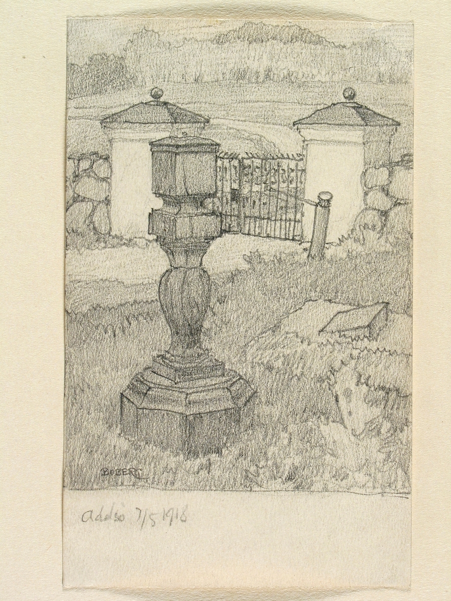Teckning av Ferdinand Boberg. Uppland, Färentuna hd., Adelsö sn., Adelsö kyrkogård, Fattigbössa