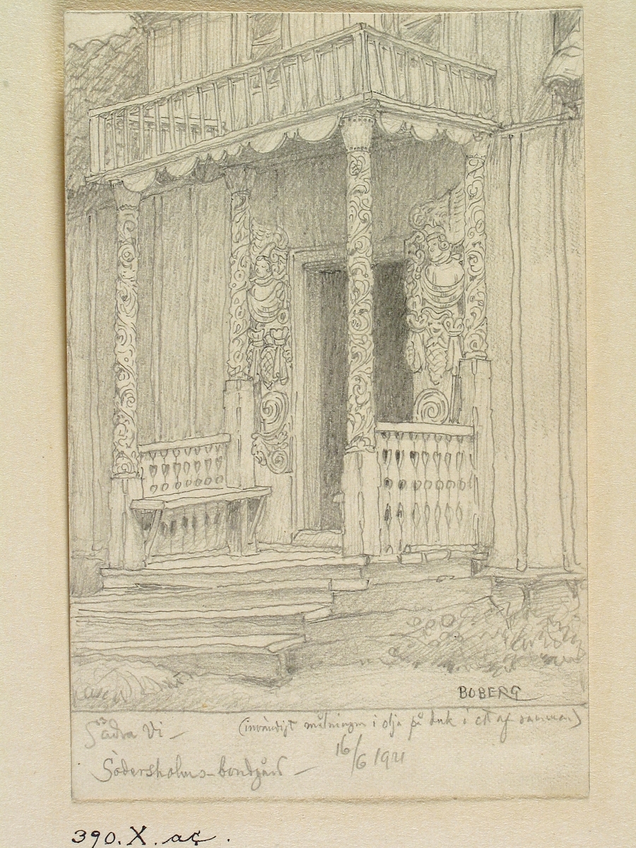 Småland, Seveda hd., Södra Vi sn. "Söderholms bondgård. (Invändigt målningar i olja på duk i ett af rummen)". Teckning av Ferdinand Boberg.