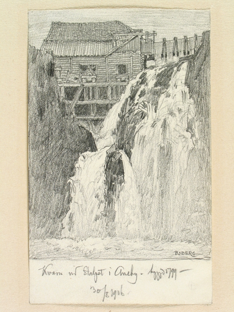 Småland, Vedbo hd., Marbäcks sn., Stalpet. "Kvarn vid Stalpet i Aneby – byggd 1799". Teckning av Ferdinand Boberg