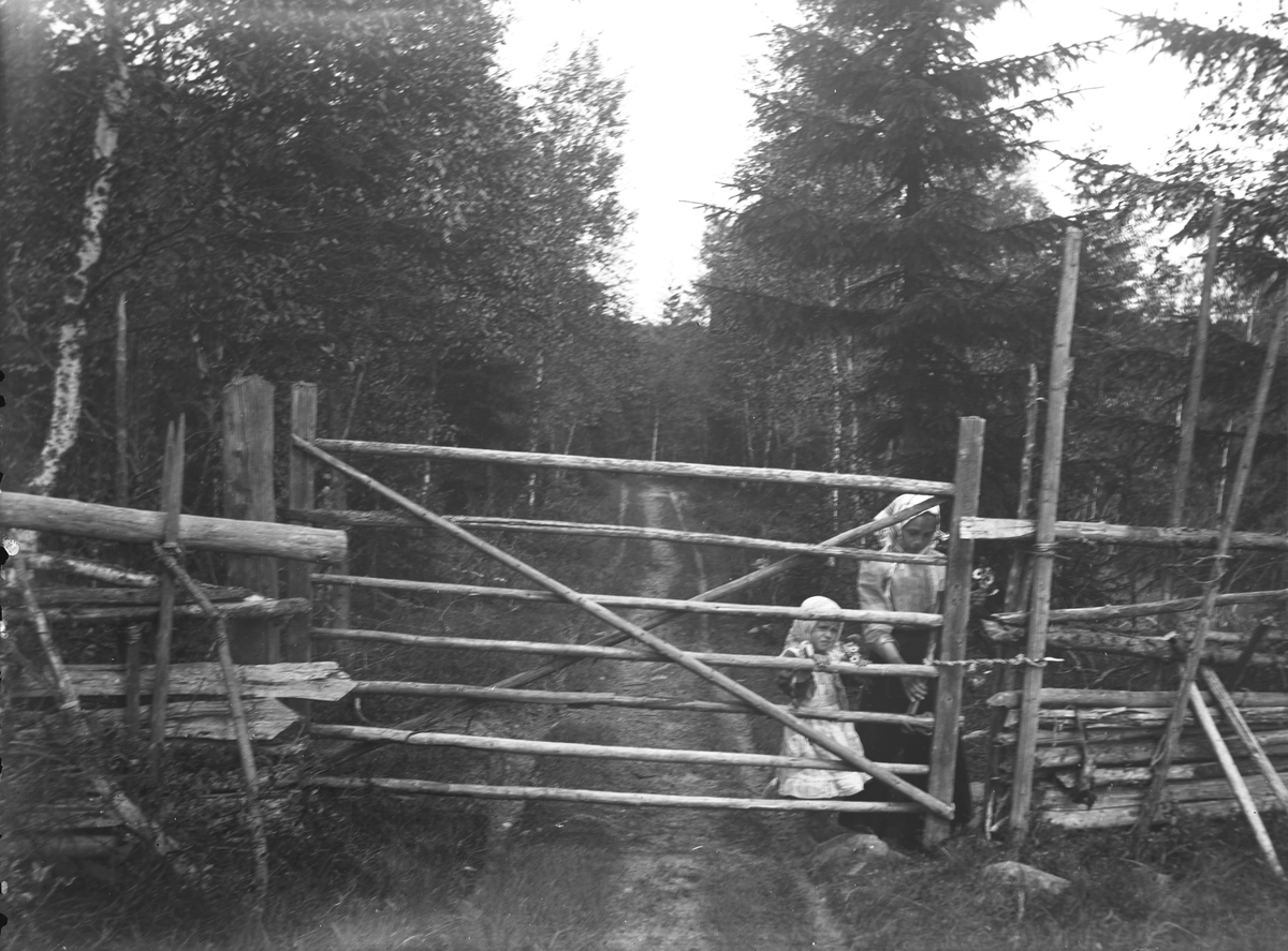 "Värmland. Jösse hd. Mangskog sn.Bjurbäcken. Grind. En vidja är fästad vid hitre stören närmast grinden. I andra ändan af vidjan sitter en käpp, med hvilken grinden stänges."
