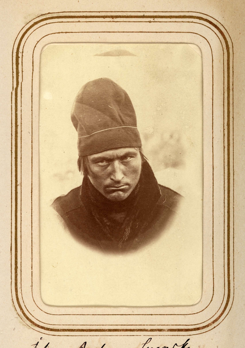 Porträtt av Johan Anders Svensk, 25 år, Jokkmokk. Ur Lotten von Dübens fotoalbum med motiv från den etnologiska expedition till Lappland som leddes av hennes make Gustaf von Düben 1868.