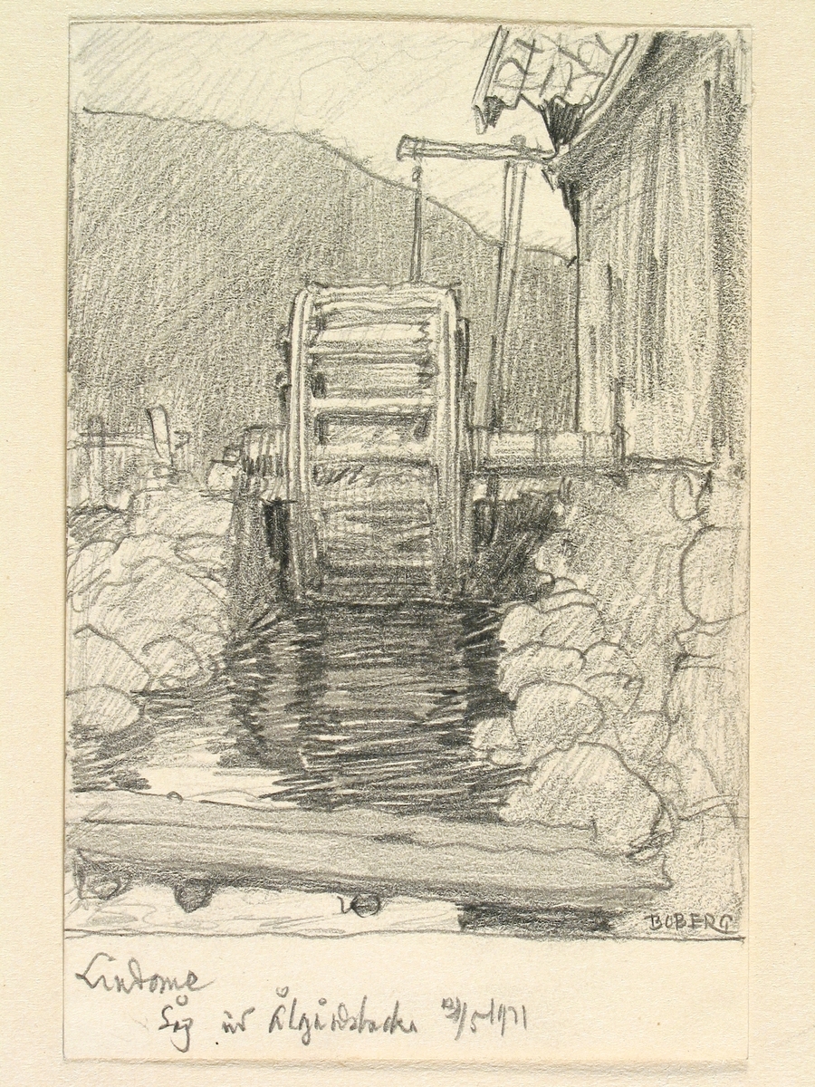 Halland, Fjäre hd., Lindome sn. Såg vid Ålgårdsbacka. Teckning av Ferdinand Boberg