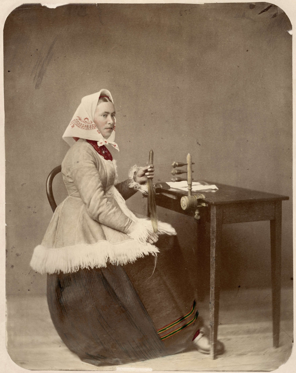 Hårkulla, klädd i folkdräkt från Dalarna, arbetar med hårarbete. Handkolorerat foto.