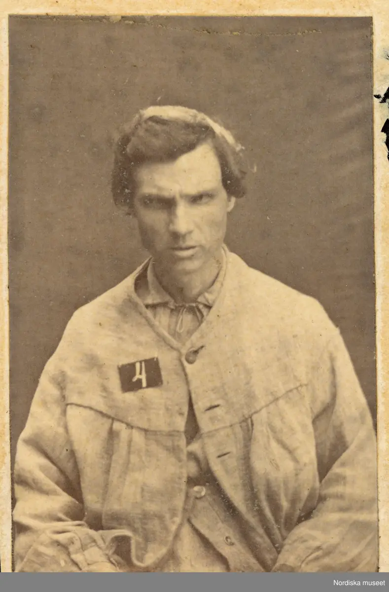 Ur "Photografiskt Album för år 1861 öfver fångar förvarade å Warbergs fästning". Fånge N:o 109 C.J. Kjellberg. Fjärde resan stöld. 40 år gammal, född i Ljungby sn., Kalmar län. Rymmare från Landskrona fästning.