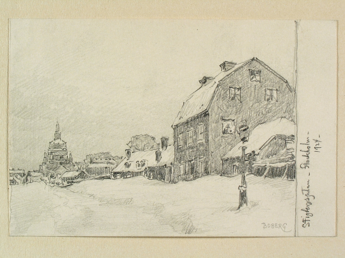 Stockholm, Söder, Stigbergsgatan, Teckning av Ferdinand Boberg.I änden av gatan syns Katarina Kyrka