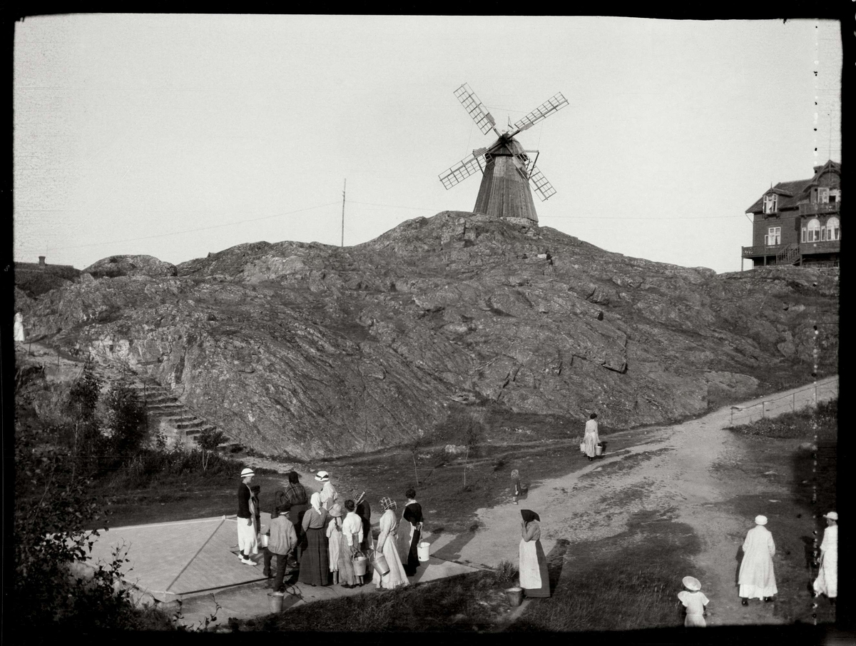 Fiskebäckskil, brunn. Människor samlade vid en brunn, i bakgrunden väderkvarn.