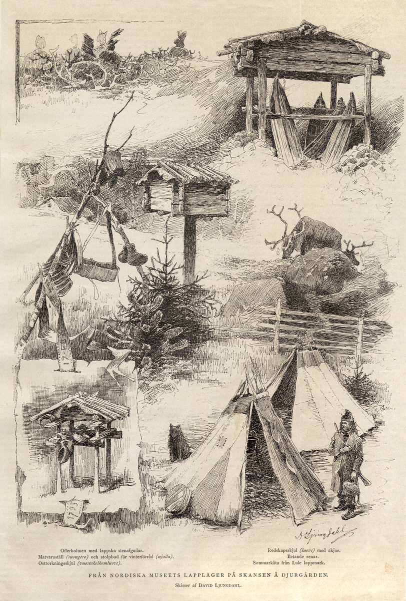 Skisser av David Ljungdahl i Ny illustrerad tidning nr 33-35. 1891 31/10. ”Från Nordiska museets Lappläger på Skansen å Djurgården.”