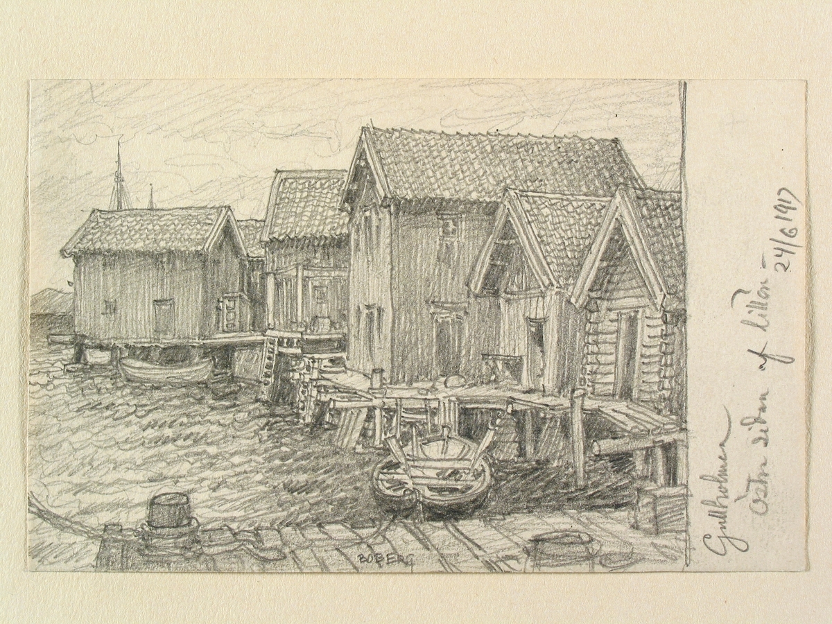 Bohuslän, Gullholmen. "Östra sidan af lillön". Fiskebodar, roddbåtar. Teckning av Ferdinand Boberg