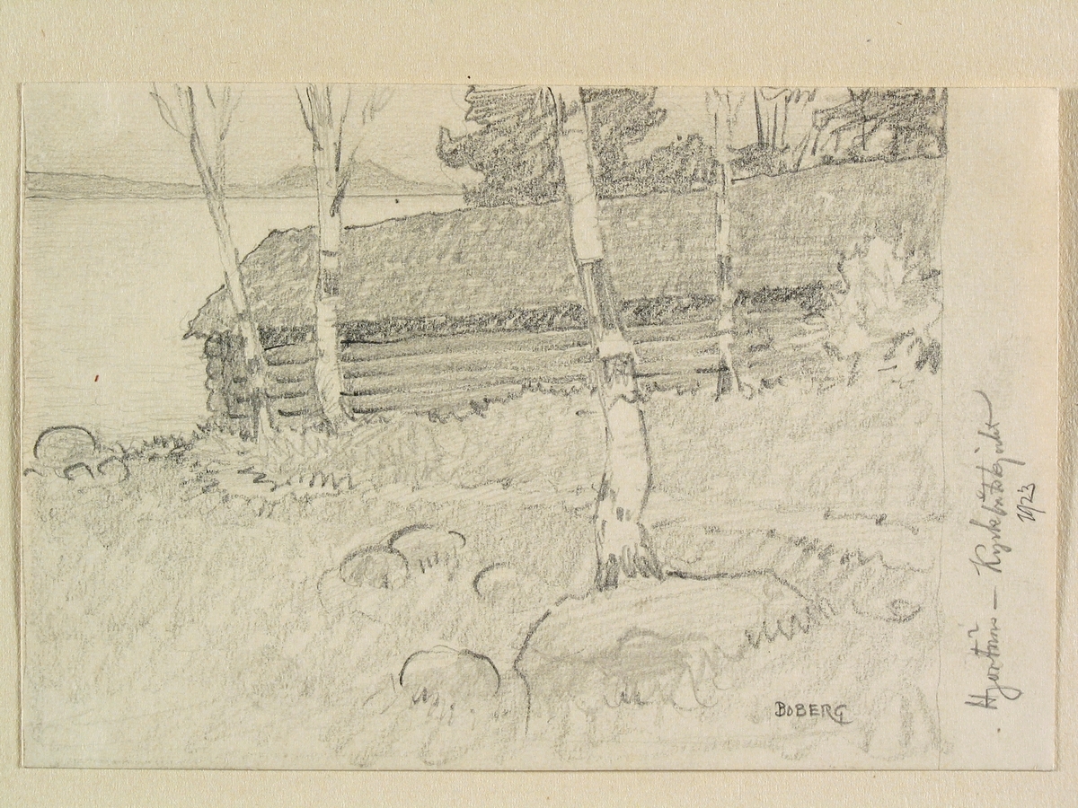 Dalarna, Leksands sn., Hjortnäs. Kyrkbåtsskjulet. Teckning av Ferdinand Boberg