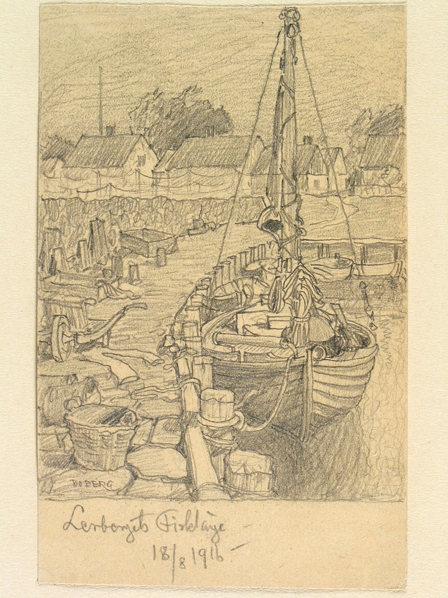 Skåne, Luggude hd., Väsby sn., Lerbergets fiskeläge. Teckning av Ferdinand Boberg