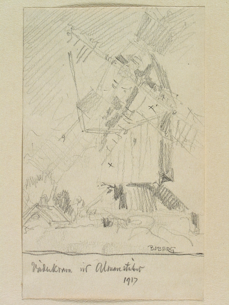 Uppland, Bro hd., Näs sn. "Väderkvarn vid Almarestäket". Teckning av Ferdinand Boberg