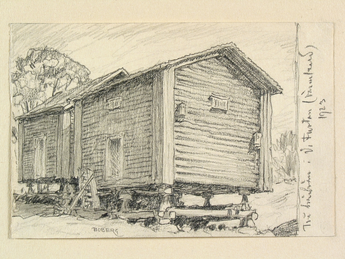 Värmland, Jösse hd., Brunskogs sn. Två härbren i Västra Furtan. Teckning av Ferdinand Boberg