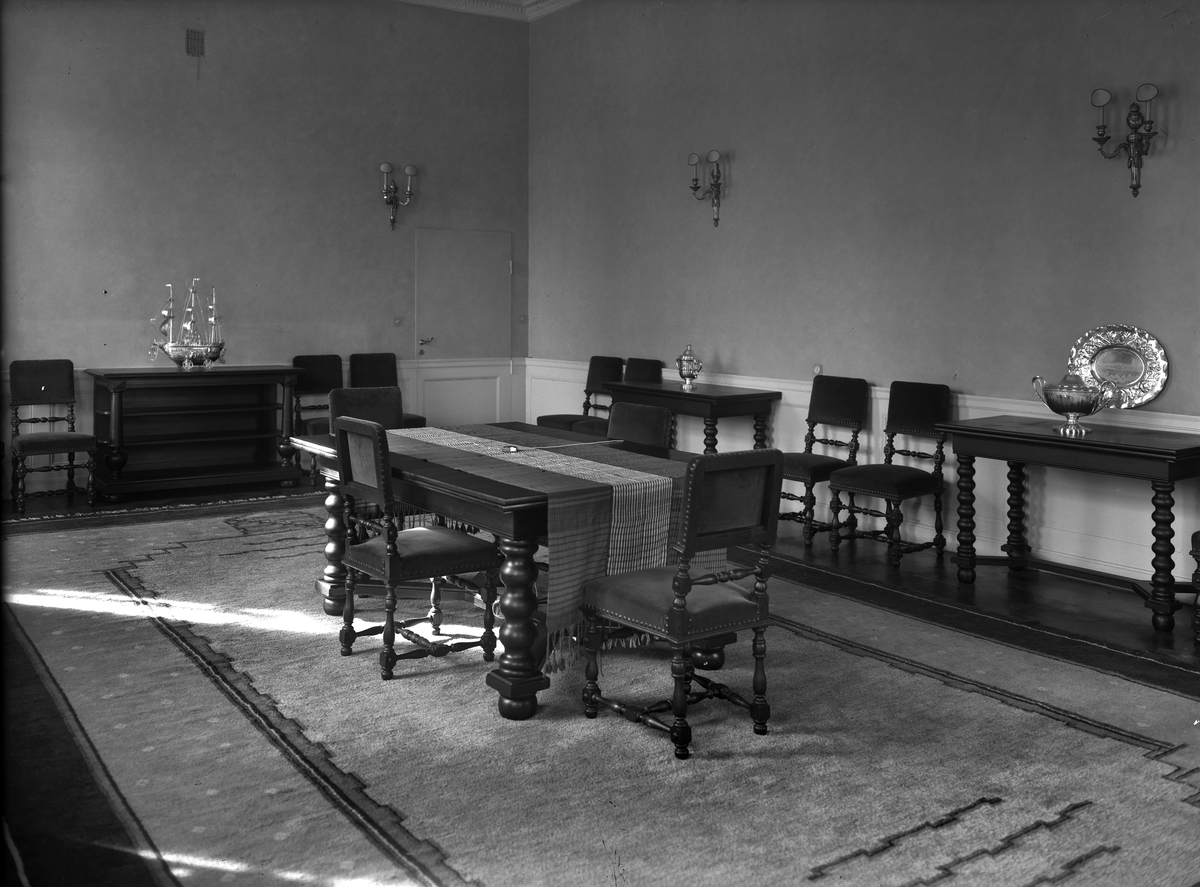 Interiör från Haga slott i Solna socken utanför Stockholm. Del av matsalen med matbord, avlastningsbord och stolar.