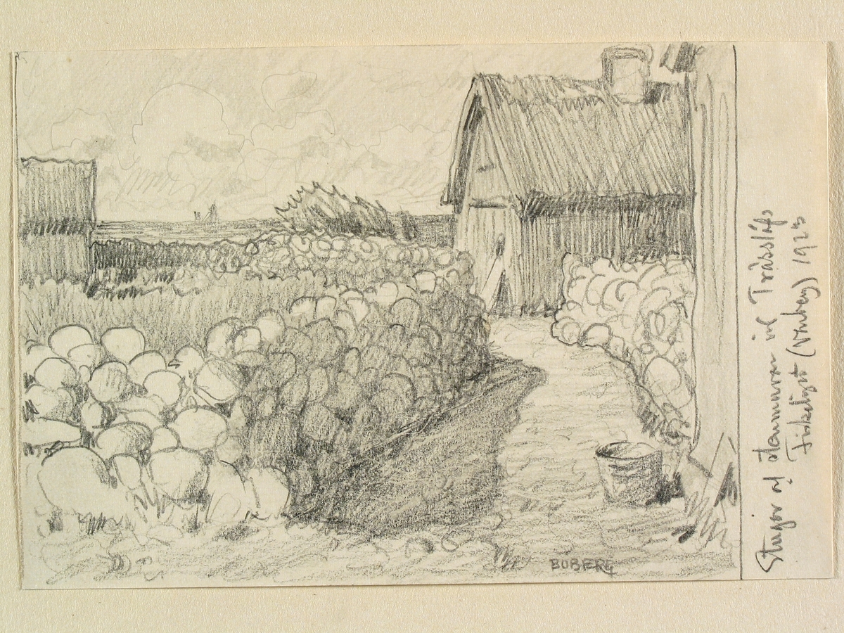 Halland, Himle hd. Stugor och murar vid Träslövs fiskeläge. Teckning av Ferdinand Boberg