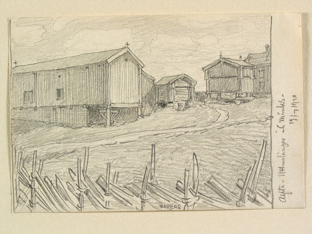Hälsingland, Alfta sn. "Uthuslängor vid Månks". Teckning av Ferdinand Boberg