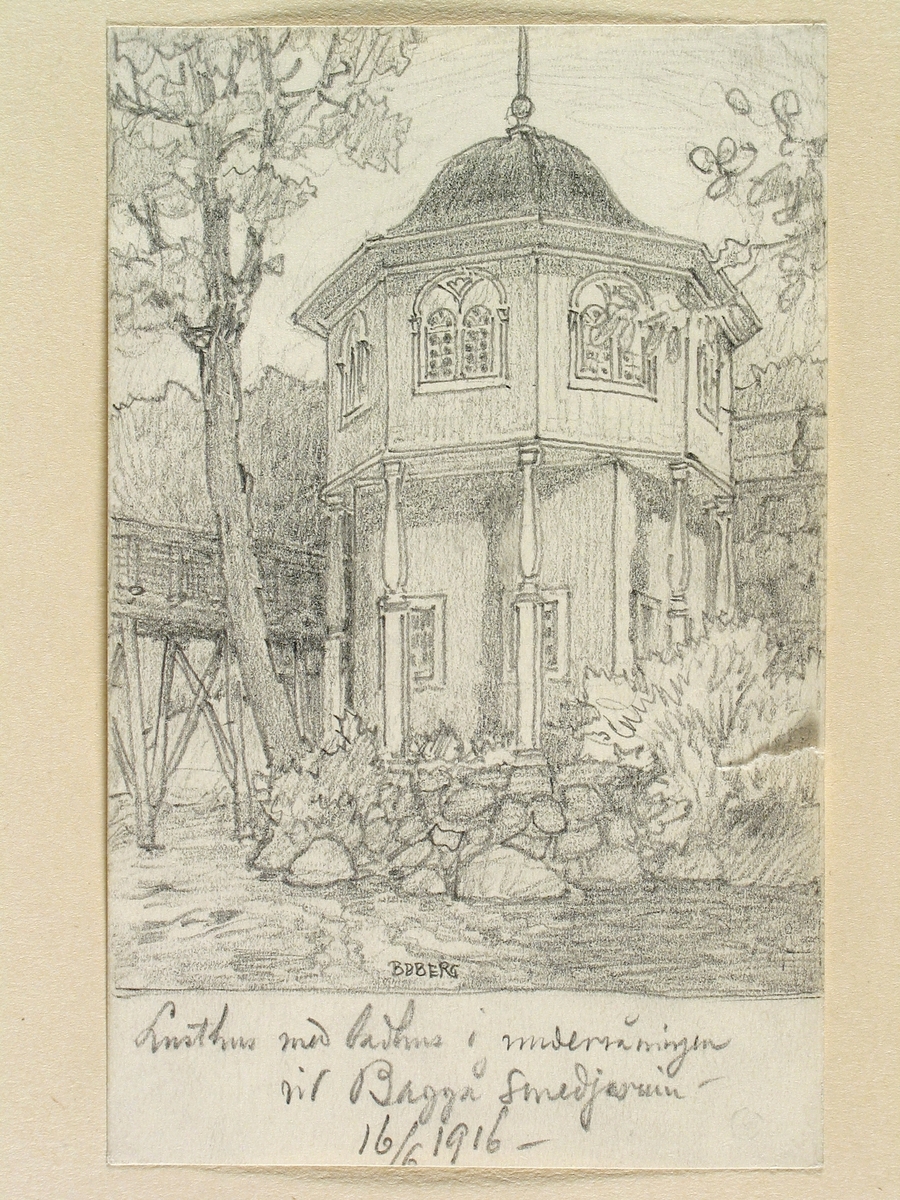 Teckning av Ferdinand Boberg. Västmanland, Skinnskattebergs sn., Baggå bruk