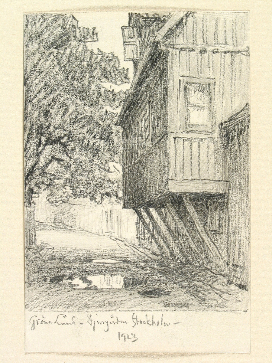 Teckning av Ferdinand Boberg. Stockholm, Djurgården , Kv. Trädgården, Långa gatan 2 och 4, Gröna Lund