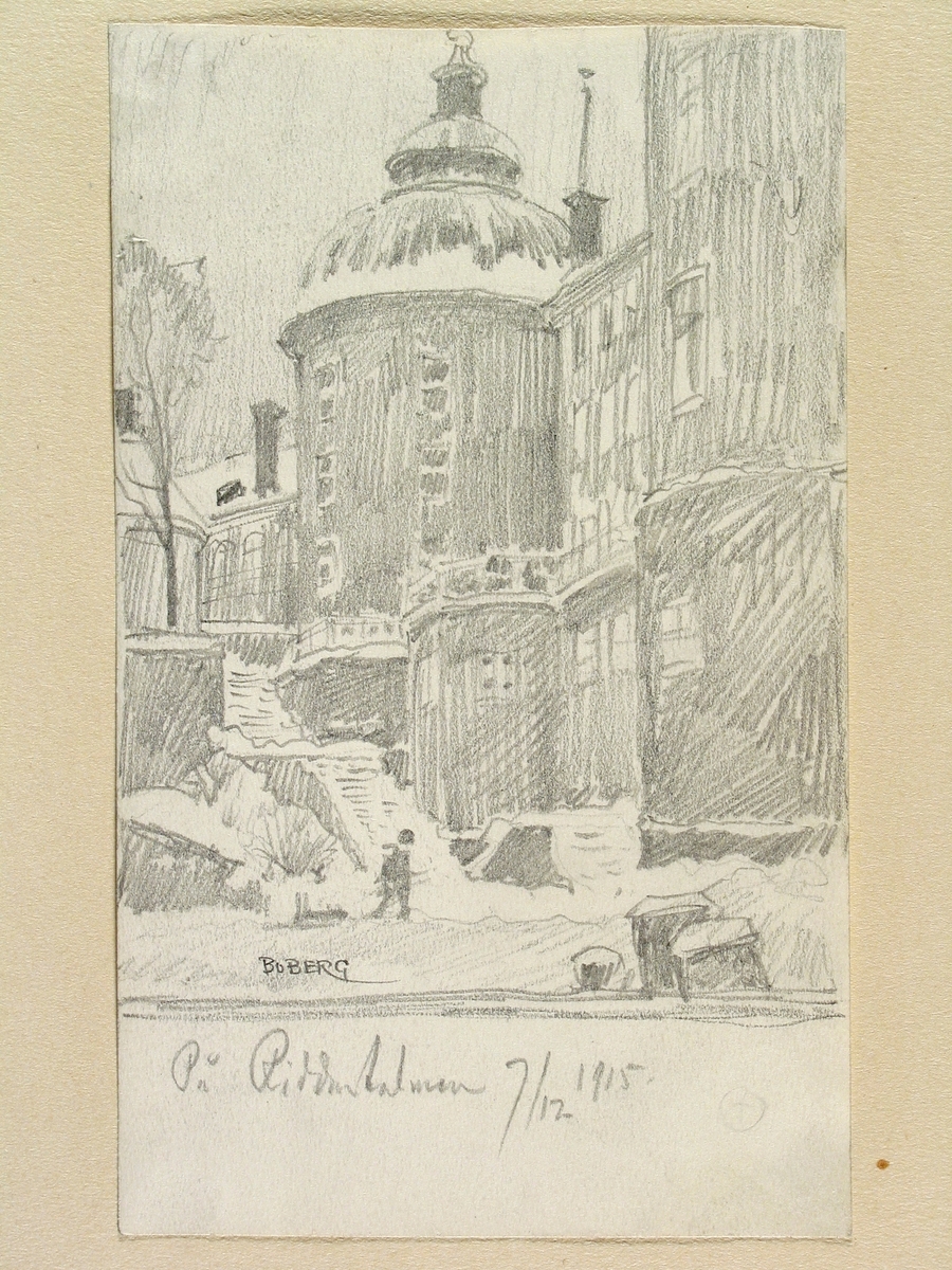 Teckning av Ferdinand Boberg. Stockholm, Staden inom br. , Riddarholmen, Kv. Kungshuset 102, Birger Jarlstorg 16, Stockholms äldsta torn